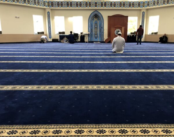 The Royal Blue Border Masjid Carpet comes in 8 feet 2 inches wide rolls, in two different lengths – 66 feet or 33 feet. Each roll offers two prayer lines (saffs), giving 10 inches foot clearance. The distance between two saffs is over 4’1”.